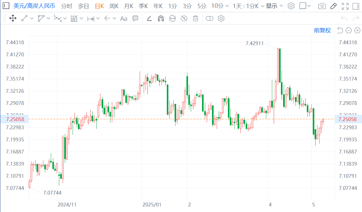 格隆汇5月9日|离岸人民币兑美元跌穿7.25关口,日内跌约100点。